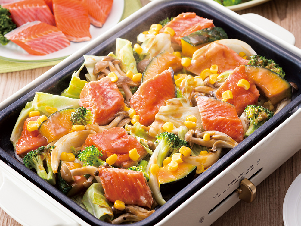 ●生秋鮭(切り身)…3切れ(そぎ切り) ●キャベツ…300g(ざく切り) ●かぼちゃ…150g(2cm厚のくし切り) ●玉ねぎ…150g(1cm幅のくし切り) ●ブロッコリー…150g(小房にわける) ●しめじ…100g(小房にわける) ●コーン…1/2カップ