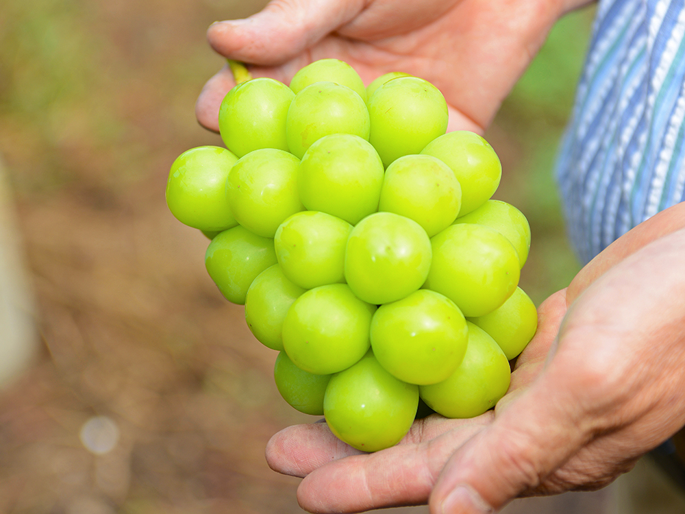 ブドウ栽培に適した土地で、愛情を注がれて育ったシャインマスカット。「今年は日照不足や長雨で、栽培は例年以上に大変でしたが、手をかけたぶんだけ味も食感もいいブドウが育ちました」と教えてくれたのは、生産者の廣瀬さんです。