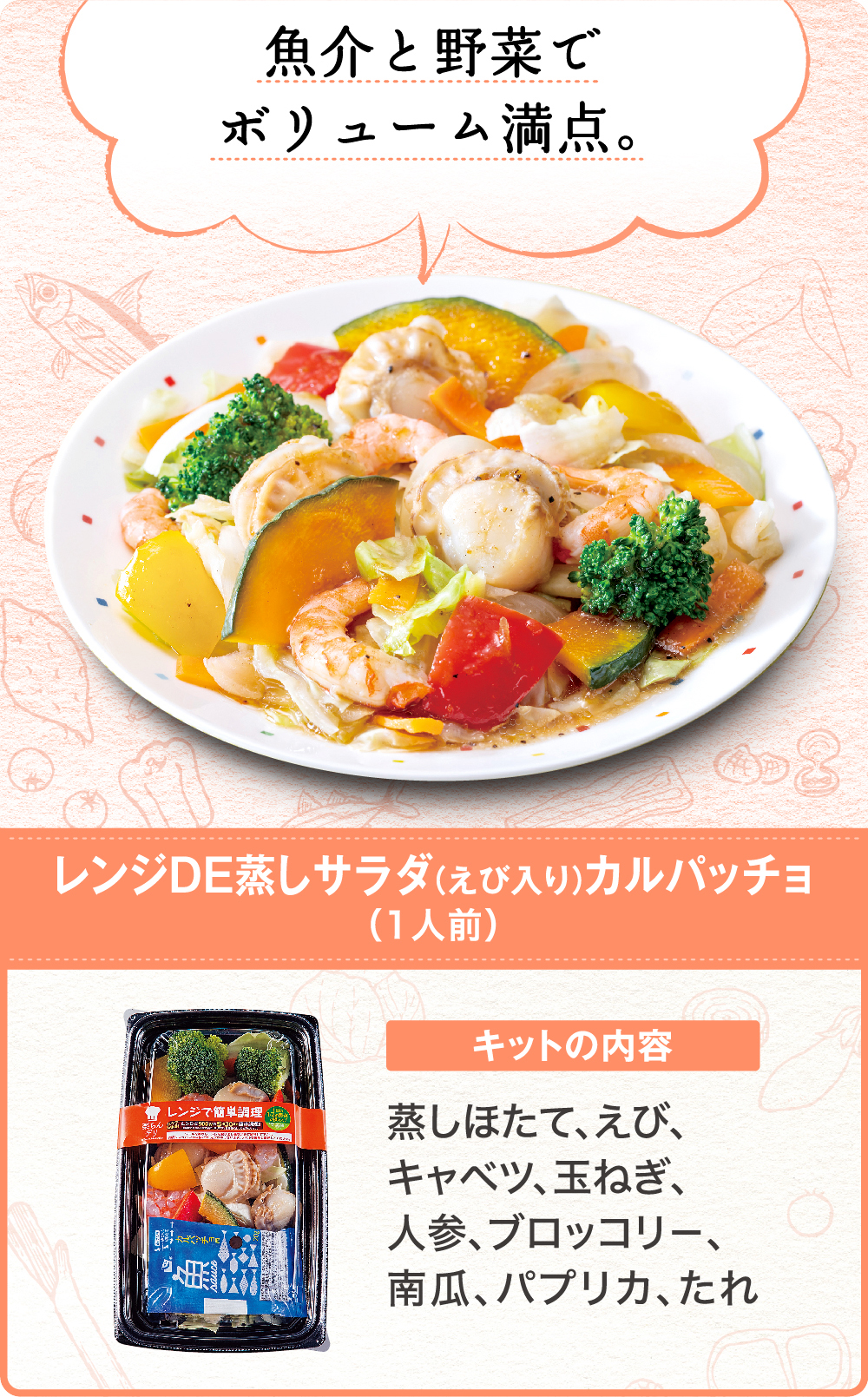 たっぷり魚介と野菜入り!「レンジDE蒸しサラダ(えび入り)カルパッチョ」