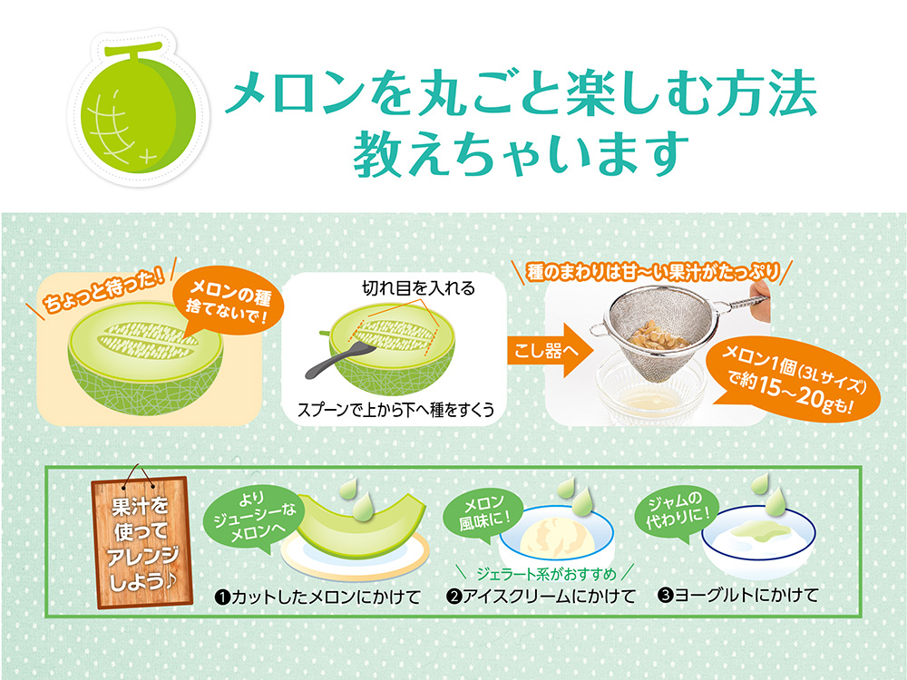 種のまわりは糖度が高く、取り除く際に湧き出る果汁はメロンジュースそのもの! メロン1個(3Lサイズ)につき、約15〜20gもあるとのことなので、ぜひ、甘みを蓄えた果汁をアレンジに使ってみてください。