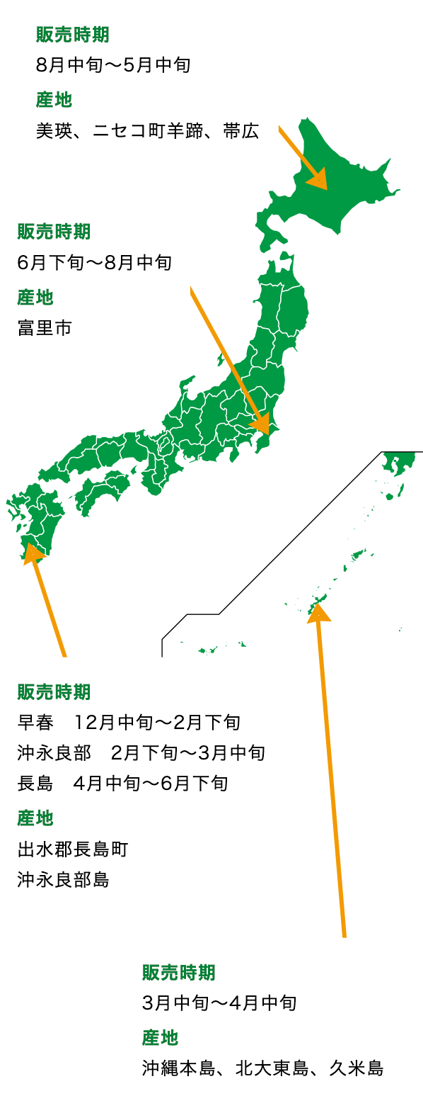 涼しい地域では、呼吸作用が静かに行われる為、でんぷん質が多くおいしくなります。また、でんぷん質は時間が経つと糖に変換されますので、秋から冬に掛けての味わいの変化もお楽しみください。