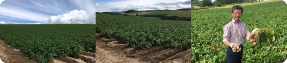 十勝岳の火山灰で出来ている美瑛の圃場は、赤土系統の火山灰土で、水はけがよく、土が柔らかいのが特徴です。そのため、「じゃが芋」の肌目が良く、皮がキレイなのが特徴です。